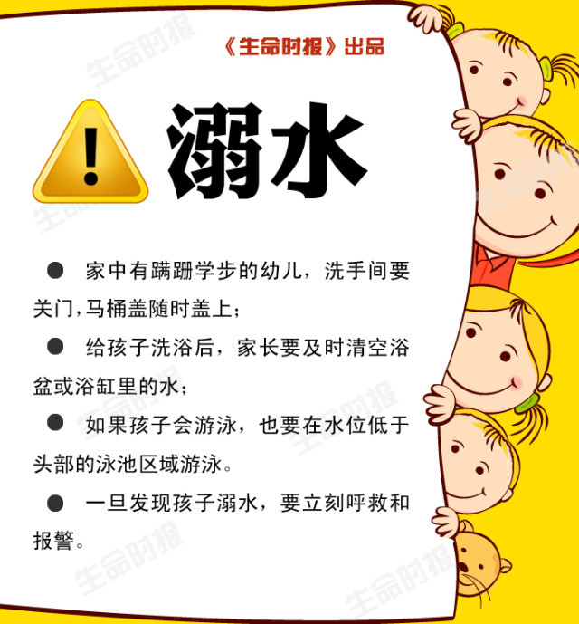 近年来,关于儿童安全事故的新闻屡见报端,中国疾病预防控制中心与全球儿童安全网络共同编著的《儿童意外伤害预防指导》手册指出,在我国,意外伤害是0—14岁儿童的首要死因,每天就有近200名儿童因此死亡。不过,这些意外伤害却都是可以预防的。《生命时报》针对儿童溺水、跌落、烫伤、中毒、窒息、厨房安全、乘车安全和防火安全八个方面,请专家进行了预防指导。