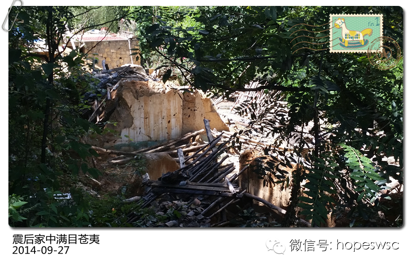 这片废墟是小芸家原来的房子,现在在房顶上有一抹绿色,小芸告诉我们:“那是希望和生命的象征。”