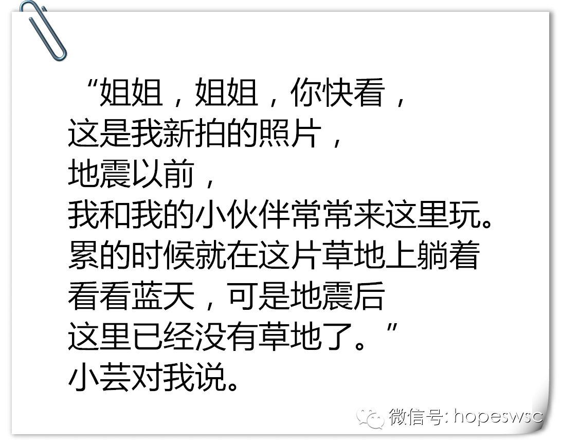 在照片故事小组里,小芸通过拍摄地震以来因地震发生变化的场景,慢慢走出了地震的阴影。现在她再也不会抱着妈妈才能入睡了。