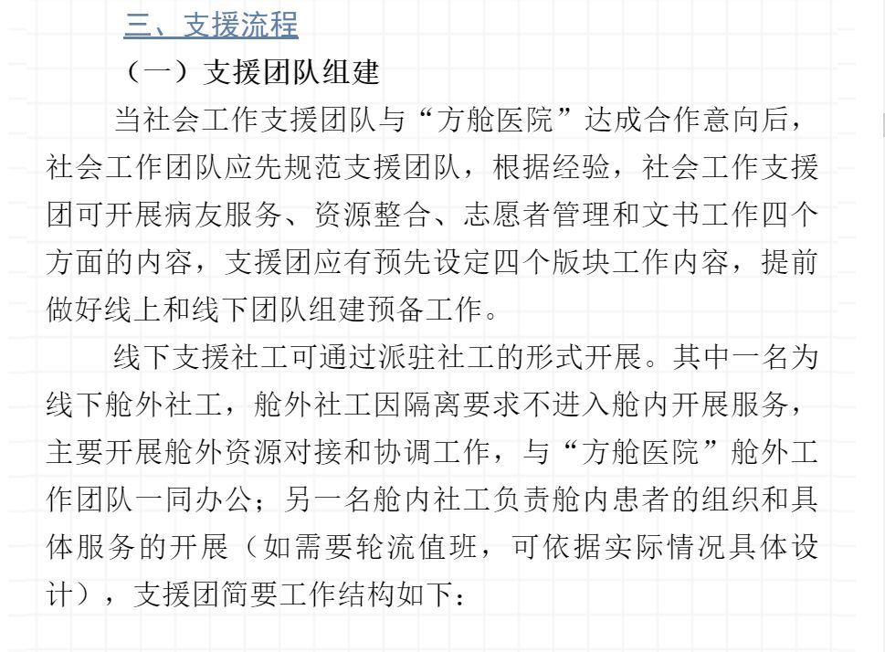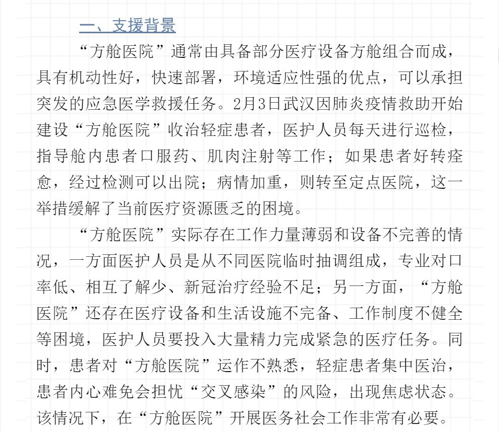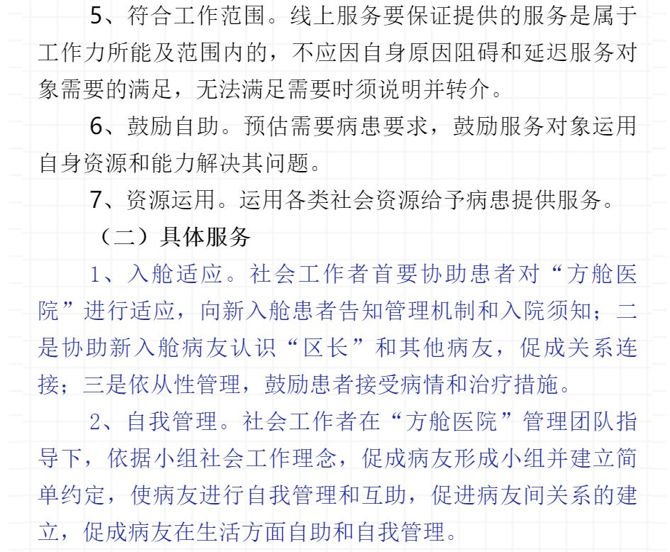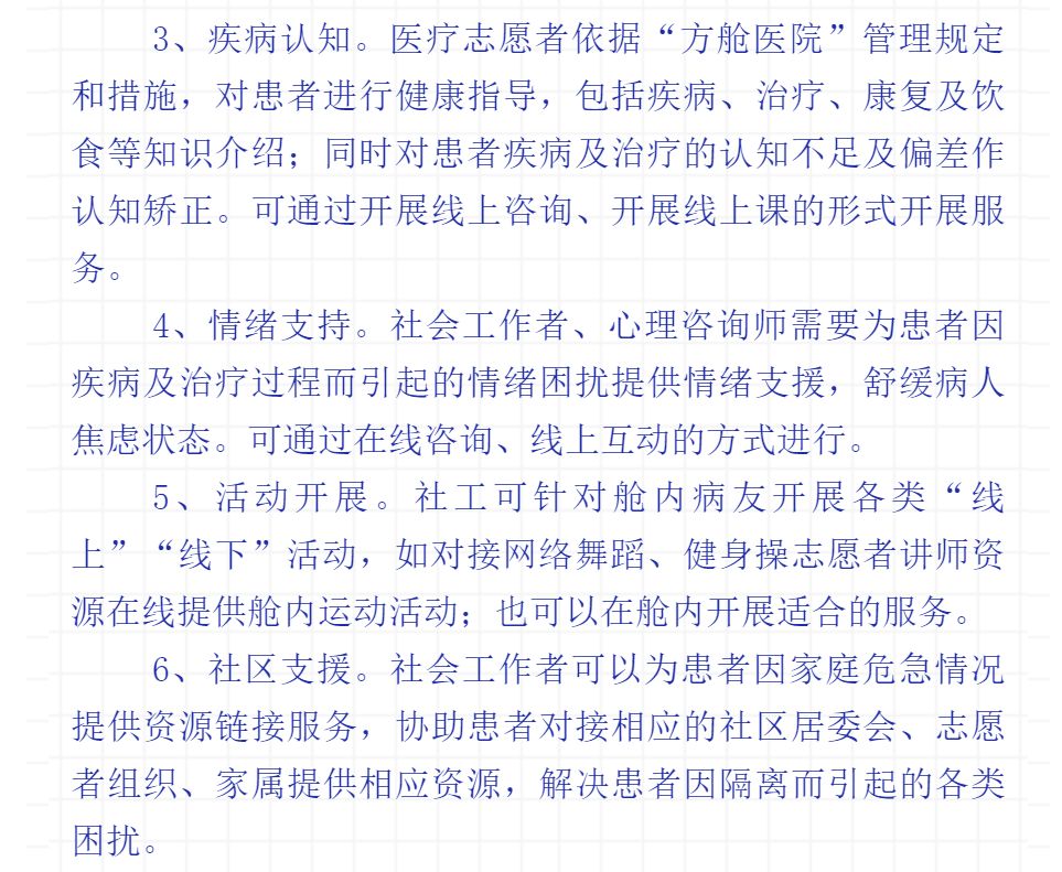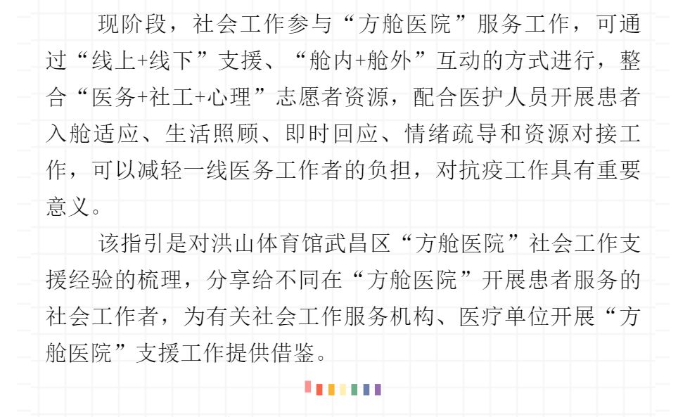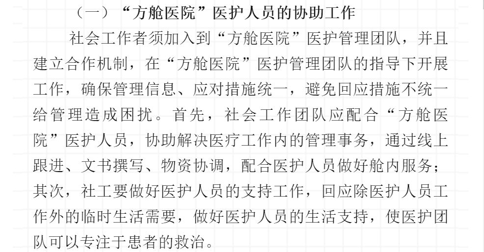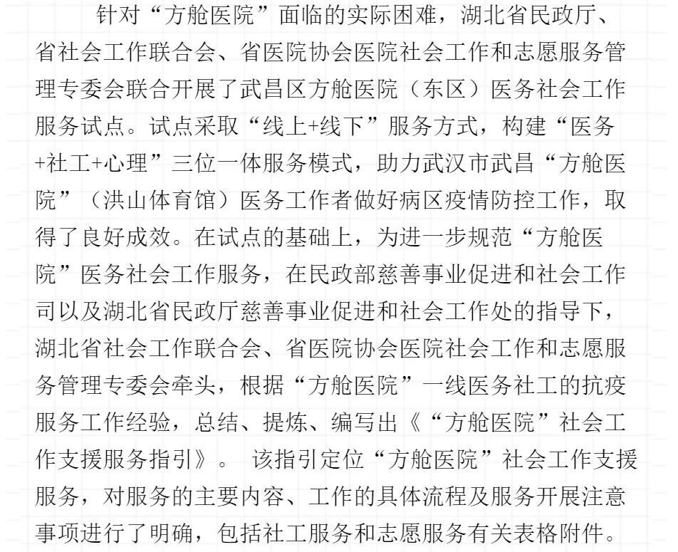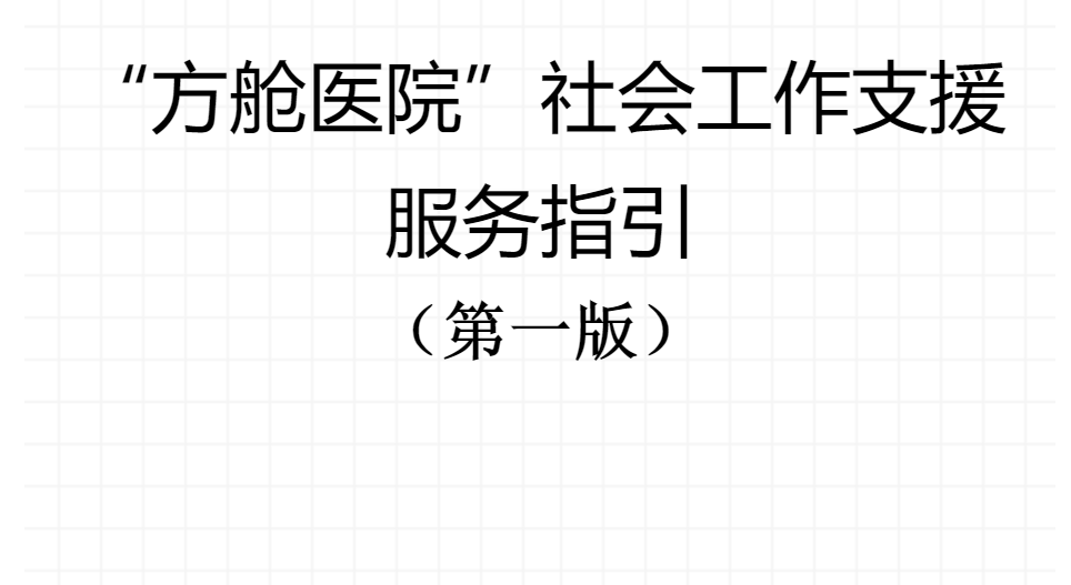 为凝聚行业力量共同抗击疫情,进一步规范“方舱医院”医务社会工作服务,在民政部慈善事业促进和社会工作司以及湖北省民政厅慈善事业促进和社会工作处的指导下,湖北省社会工作联合会、省医院协会医院社会工作和志愿服务管理专委会牵头,根据“方舱医院”一线医务社工的抗疫服务工作经验,总结、提炼、编写出《“方舱医院”社会工作支援服务指引》。 具体内容如下: