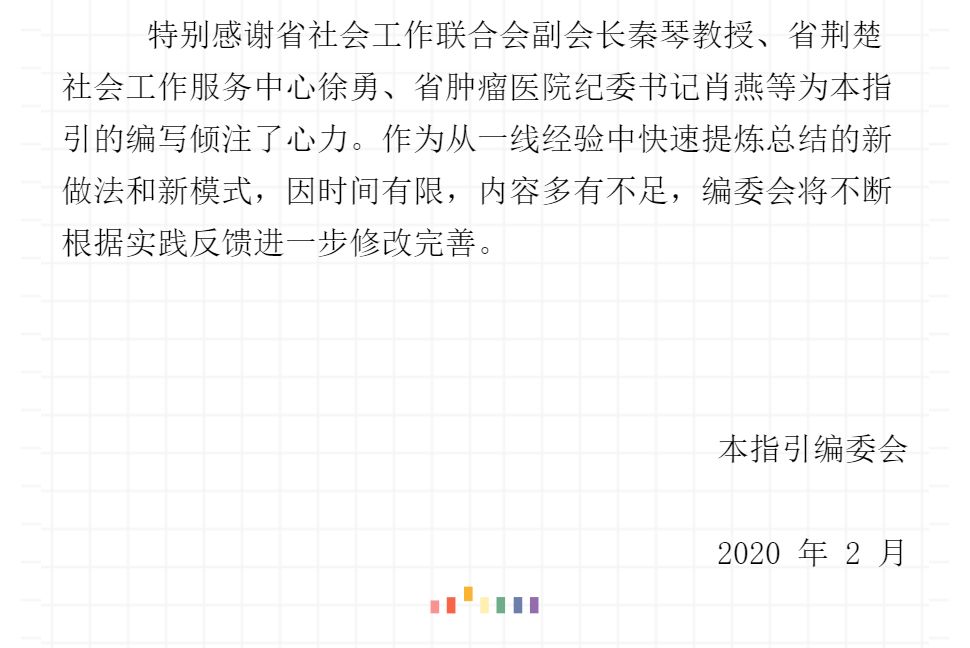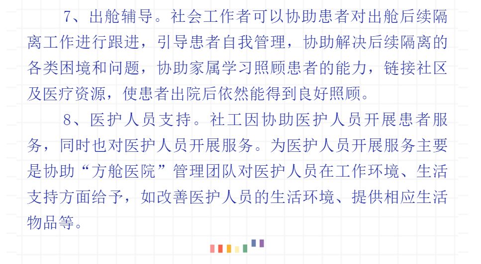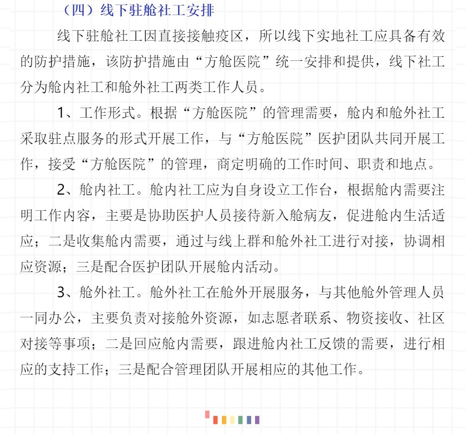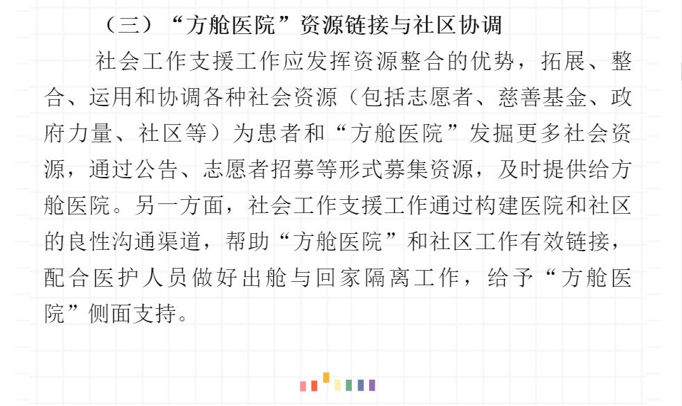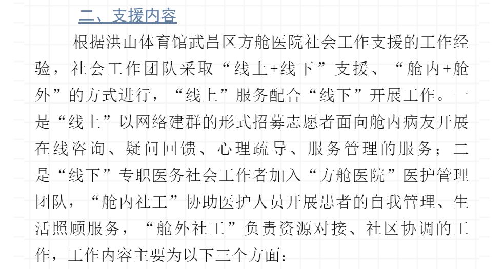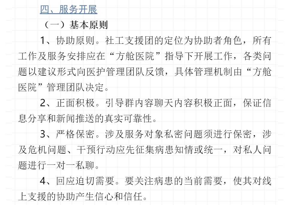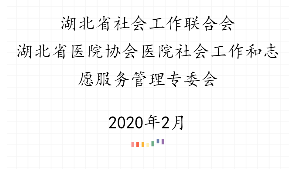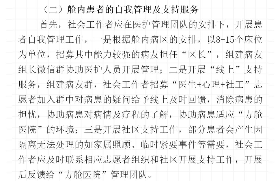 为凝聚行业力量共同抗击疫情,进一步规范“方舱医院”医务社会工作服务,在民政部慈善事业促进和社会工作司以及湖北省民政厅慈善事业促进和社会工作处的指导下,湖北省社会工作联合会、省医院协会医院社会工作和志愿服务管理专委会牵头,根据“方舱医院”一线医务社工的抗疫服务工作经验,总结、提炼、编写出《“方舱医院”社会工作支援服务指引》。 具体内容如下: