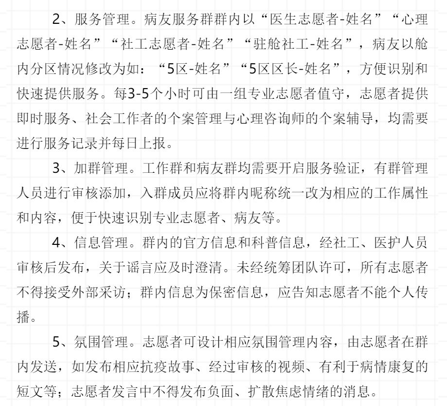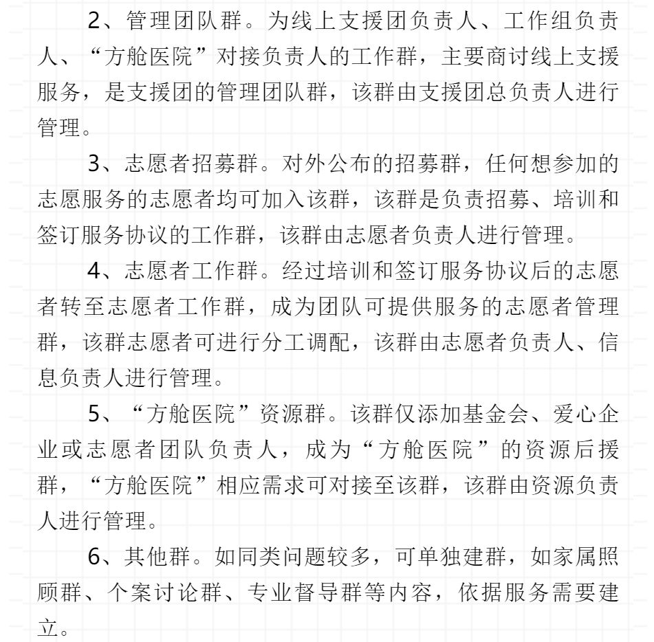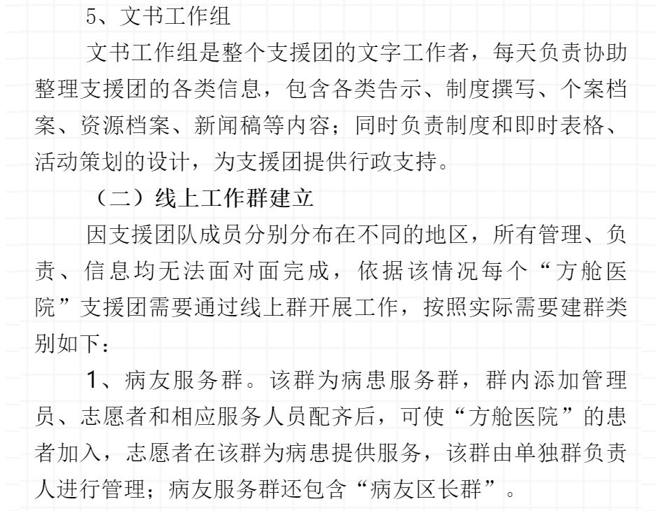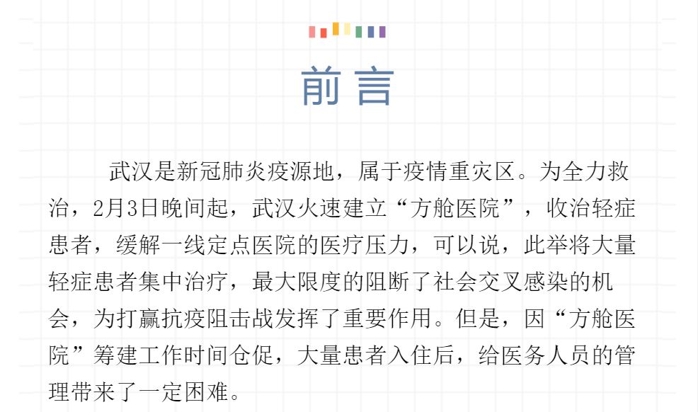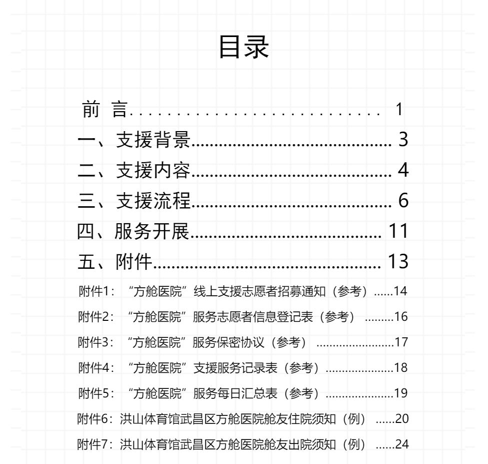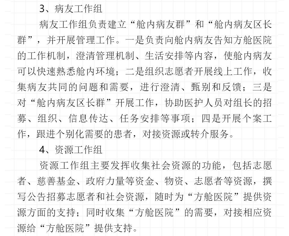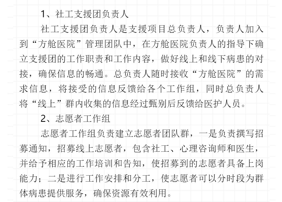 为凝聚行业力量共同抗击疫情,进一步规范“方舱医院”医务社会工作服务,在民政部慈善事业促进和社会工作司以及湖北省民政厅慈善事业促进和社会工作处的指导下,湖北省社会工作联合会、省医院协会医院社会工作和志愿服务管理专委会牵头,根据“方舱医院”一线医务社工的抗疫服务工作经验,总结、提炼、编写出《“方舱医院”社会工作支援服务指引》。 具体内容如下: