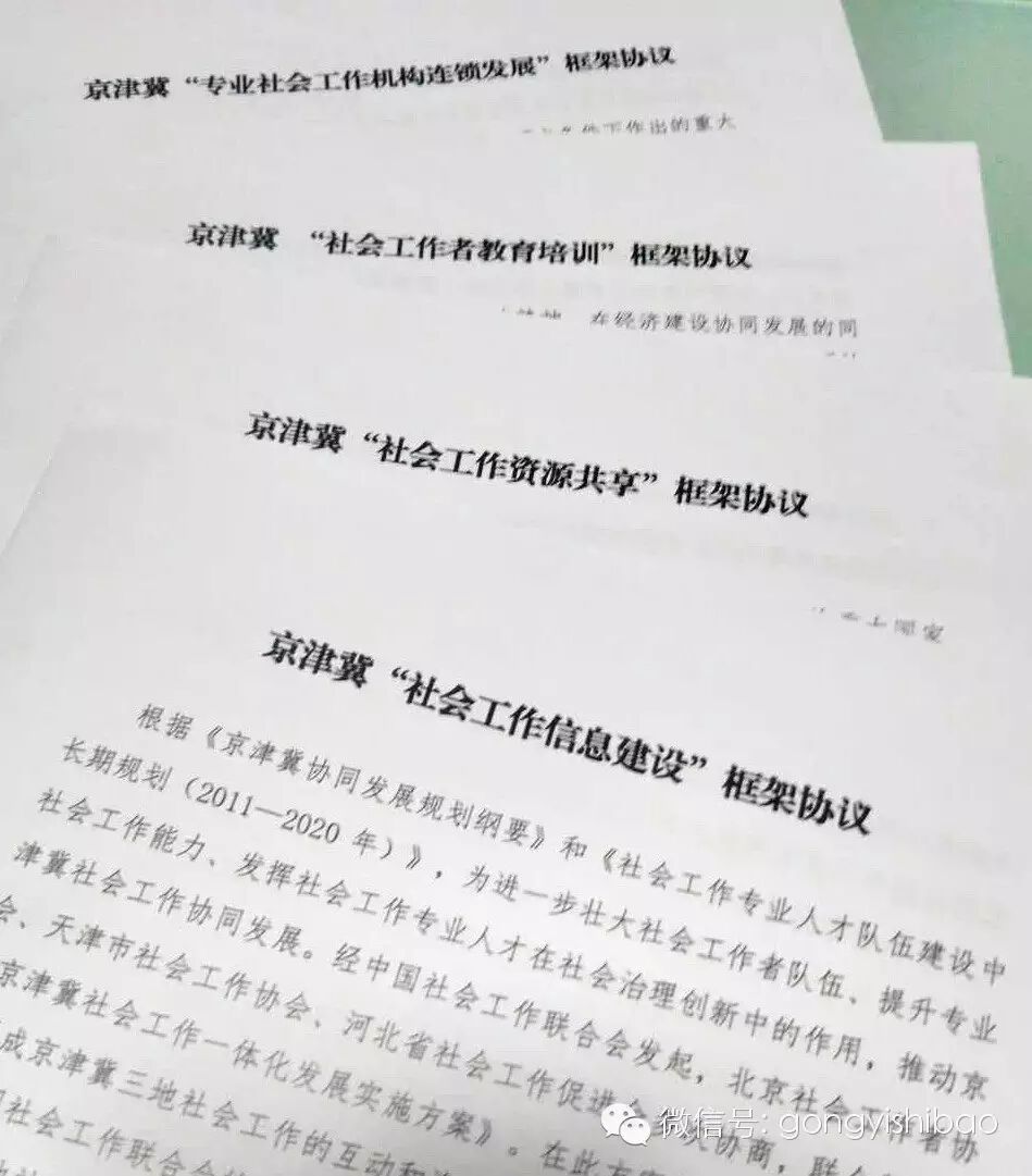社会工作领域也紧跟国家战略,4月13日,北京、天津、河北三地社会工作行业协会(促进会)在京共同签订《京津冀社会工作人才队伍建设协同发展框架协议》。这个协议中包含了社会工作者教育培训、社会工作信息建设、专业社会工作机构连锁发展、社会工作资源共享四部分。可以说是非常具体而实际的操作性文件。